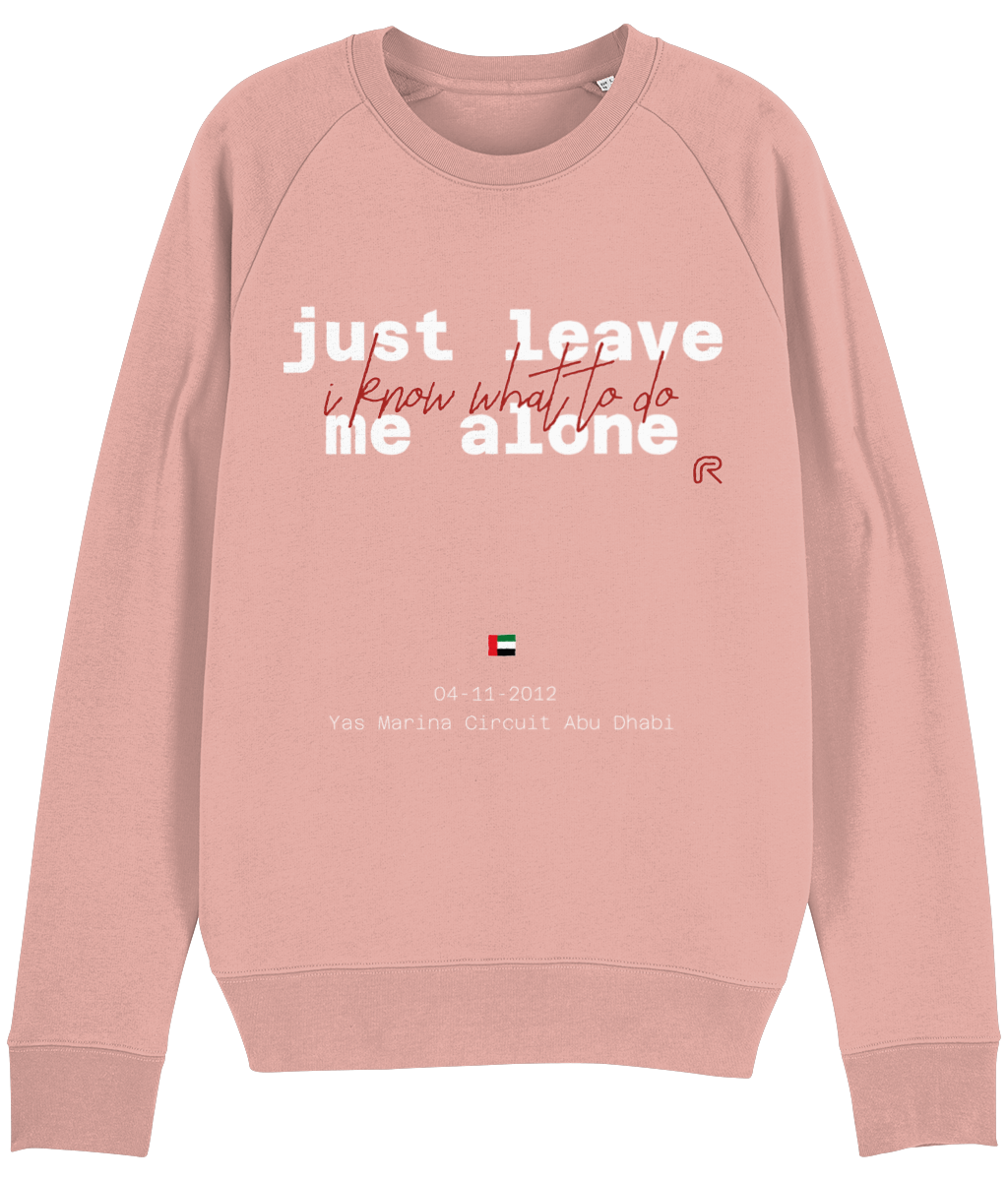 De beroemde uitspraak 'Just leave me alone, I know what to do' van Kimi is verwerkt op deze prachtige sweater.