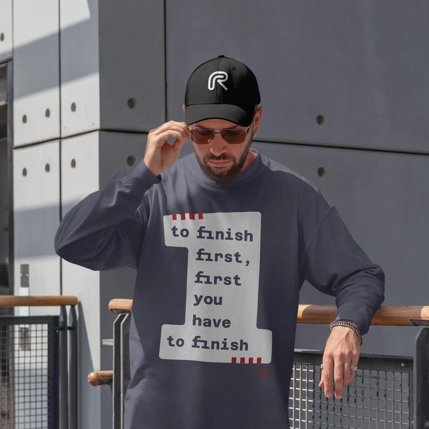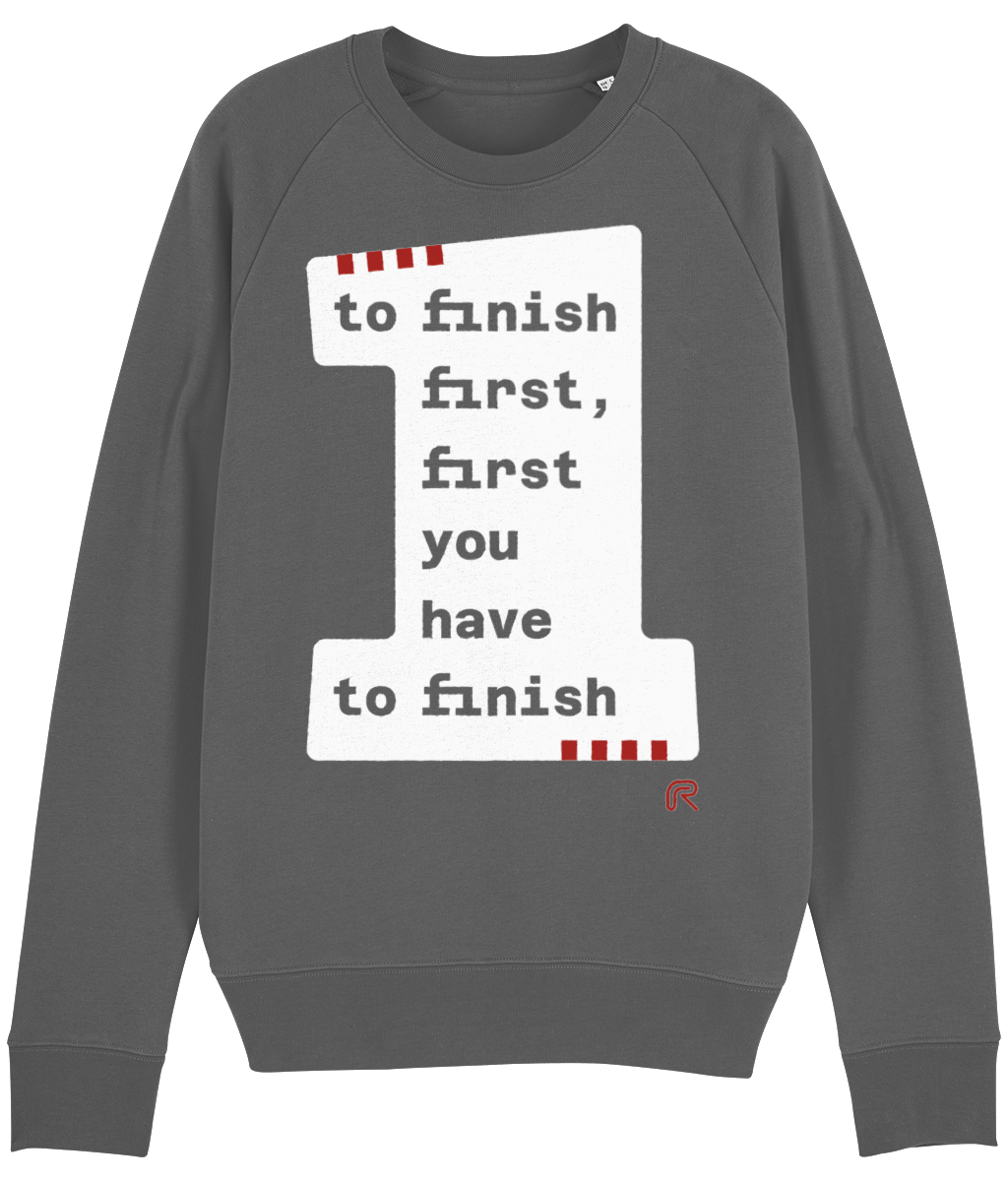 De beroemde uitspraak 'To Finish First, First You Have To Finish' is verwerkt op deze prachtige sweater.