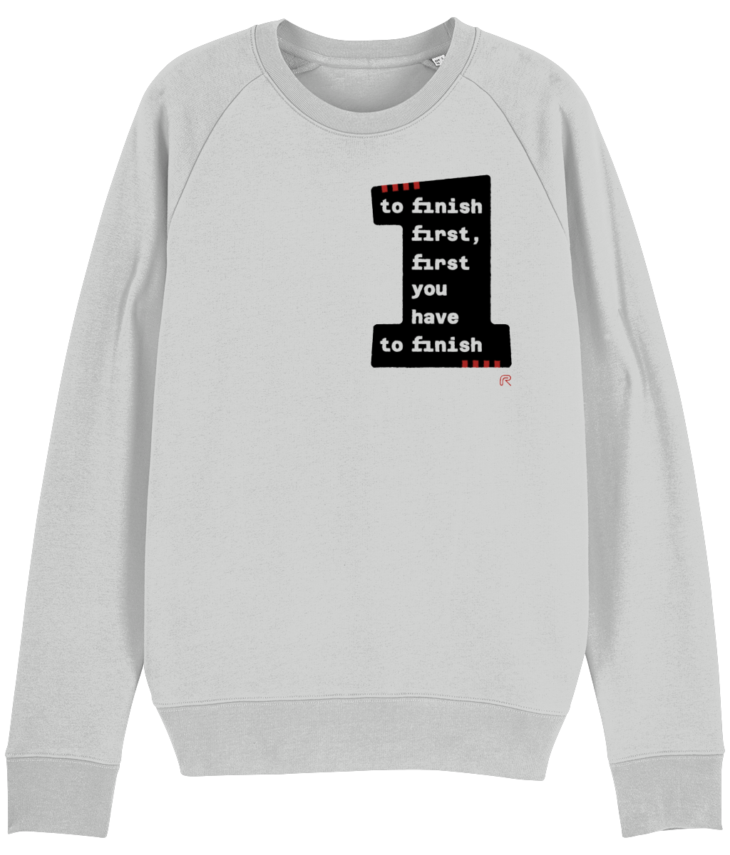 De beroemde uitspraak 'To Finish First, First You Have To Finish' is verwerkt op deze prachtige sweater.